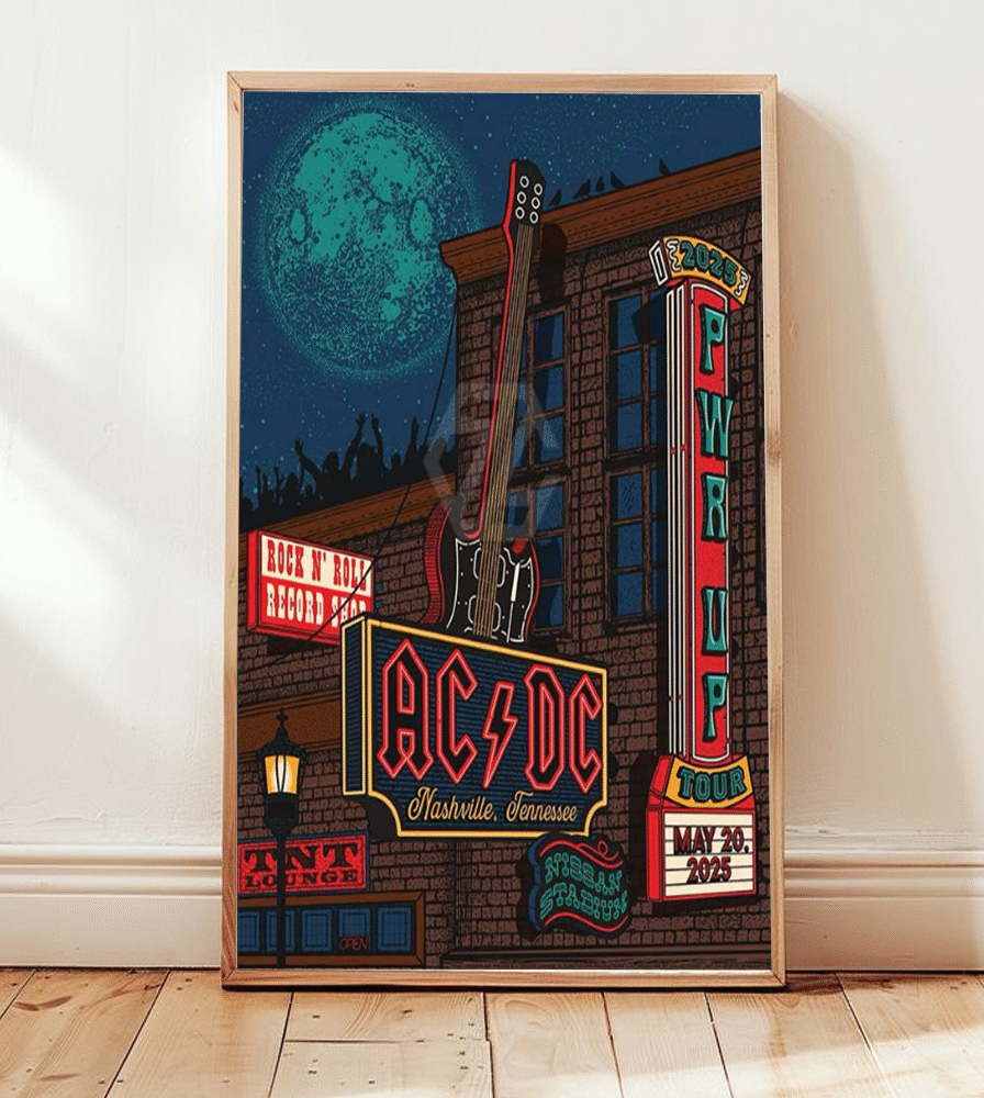 Commemorate AC/DC’s explosive return to Nashville with this limited-edition poster design from their 2025 PWR UP tour, featuring the iconic Dive Bar Pop-Up event and live show at Nissan Stadium on May 20, 2025. Capturing the gritty, electrified energy of this unforgettable stop, the artwork channels classic rock attitude with bold type, deep reds, and lightning-charged visuals.