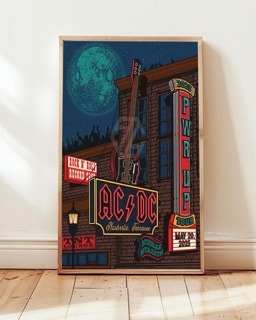 Commemorate AC/DC’s explosive return to Nashville with this limited-edition poster design from their 2025 PWR UP tour, featuring the iconic Dive Bar Pop-Up event and live show at Nissan Stadium on May 20, 2025. Capturing the gritty, electrified energy of this unforgettable stop, the artwork channels classic rock attitude with bold type, deep reds, and lightning-charged visuals.
