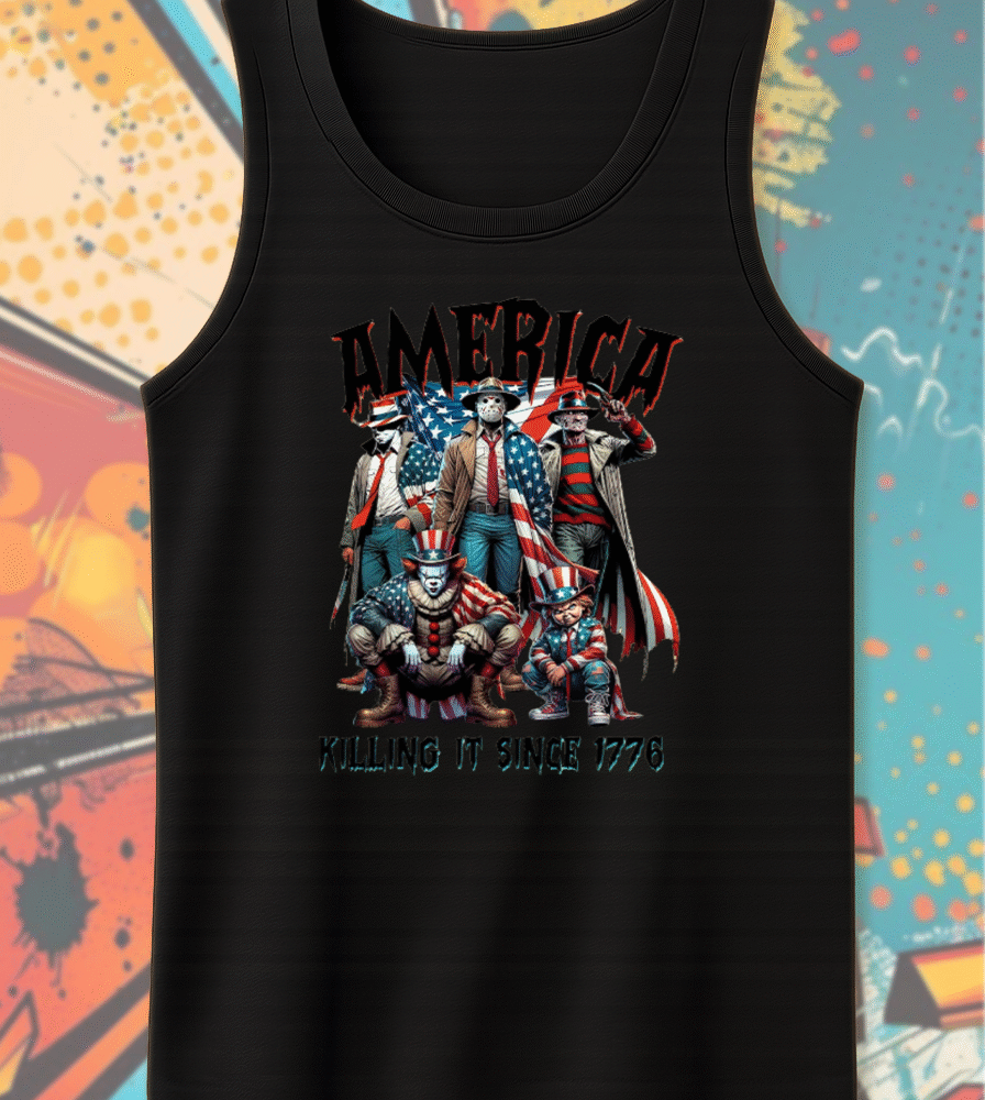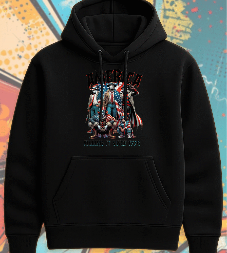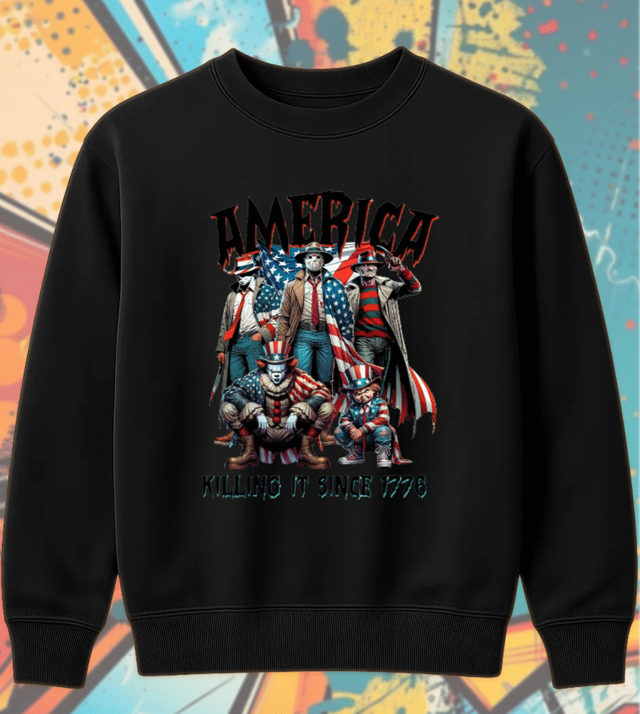 🧨 Who said patriotism can’t be terrifying? Celebrate Independence Day with killer style in this America: Killing It Since 1776 hoodie — a horror parody tribute to the stars, stripes, and slashing.