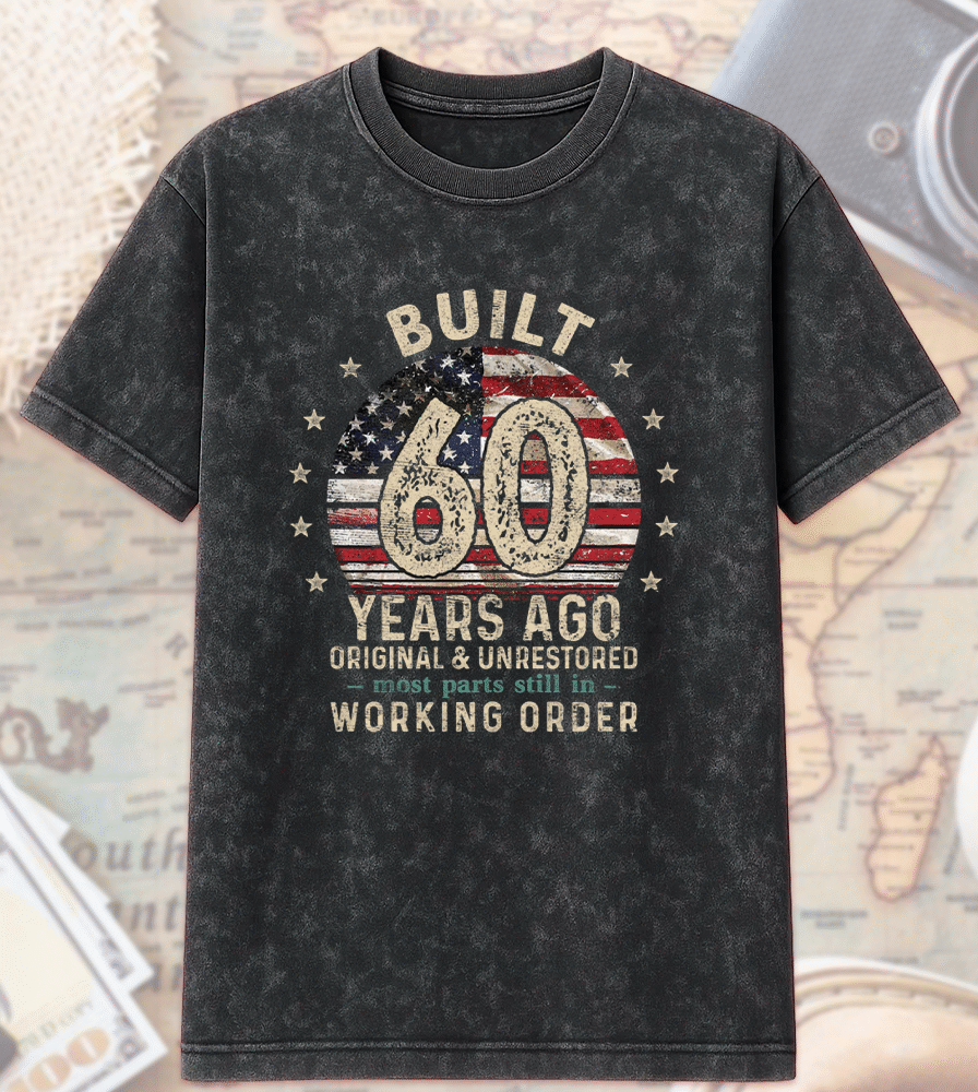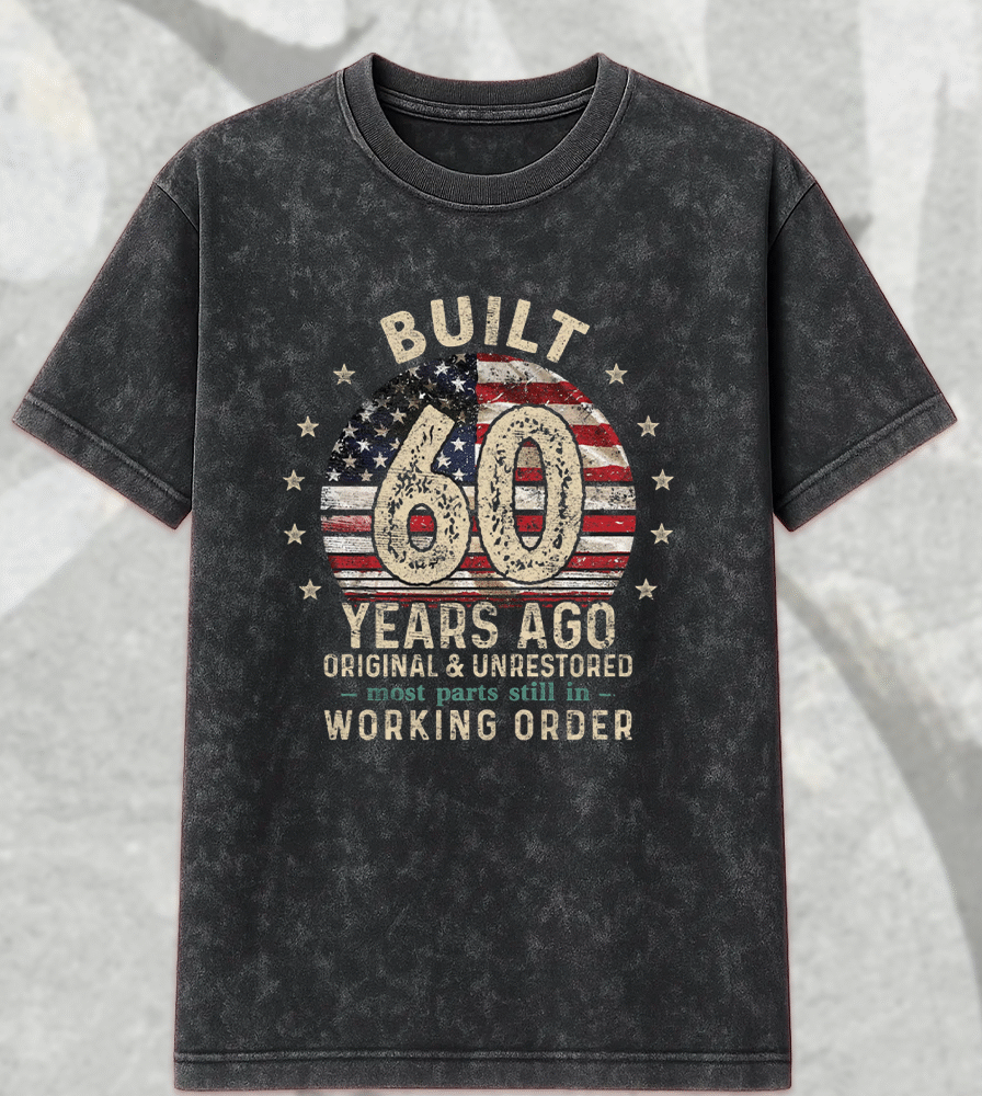 Celebrate six incredible decades in rockstar fashion with our Built 60 Years Ago Shirt – Vintage 1965 design, now available on ultra-cool Acid Wash T-Shirts and cozy Hoodies. Whether you’re gifting your dad, grandpa, husband, or friend turning 60, this bold retro look makes a standout birthday gift.
