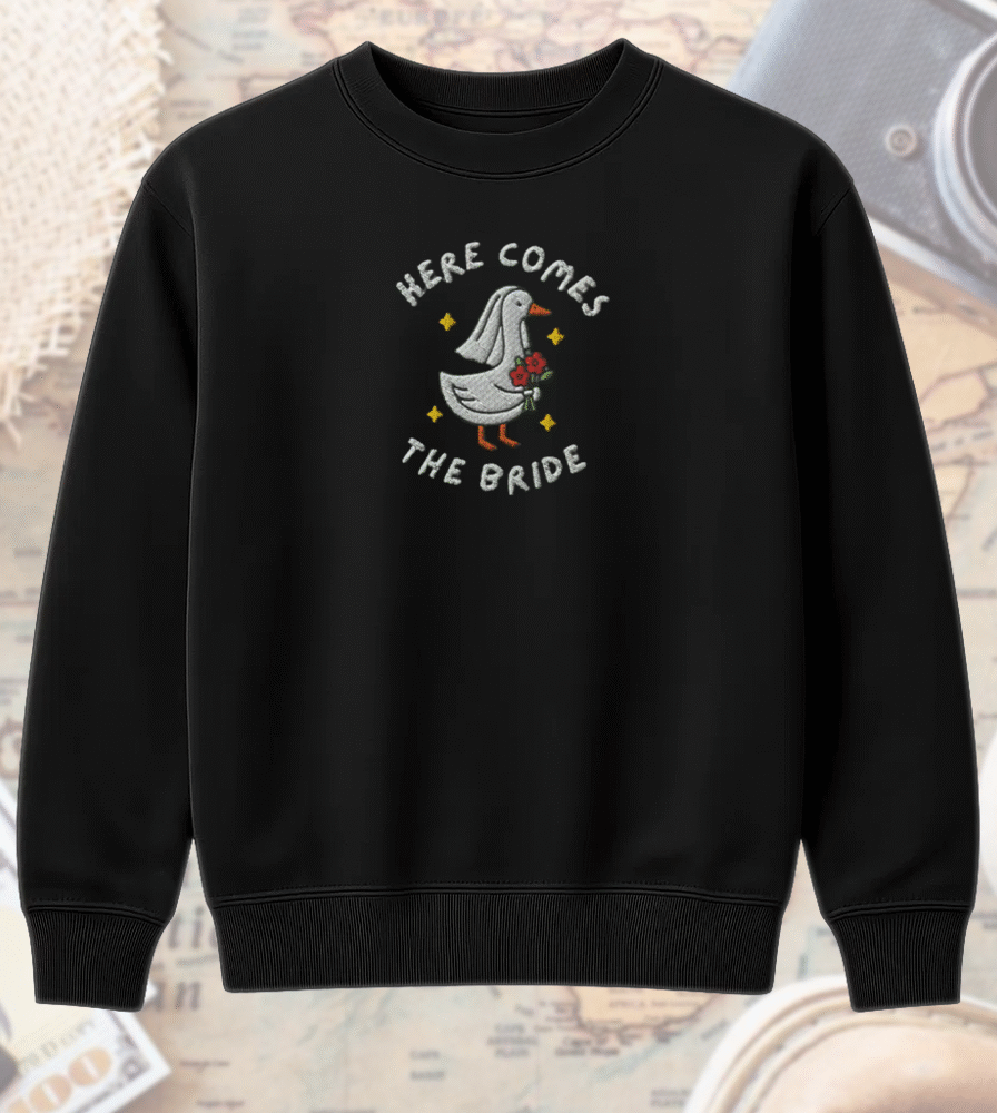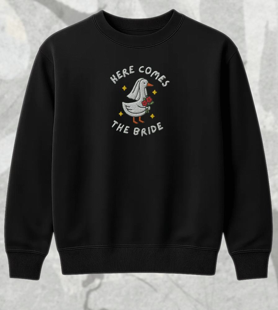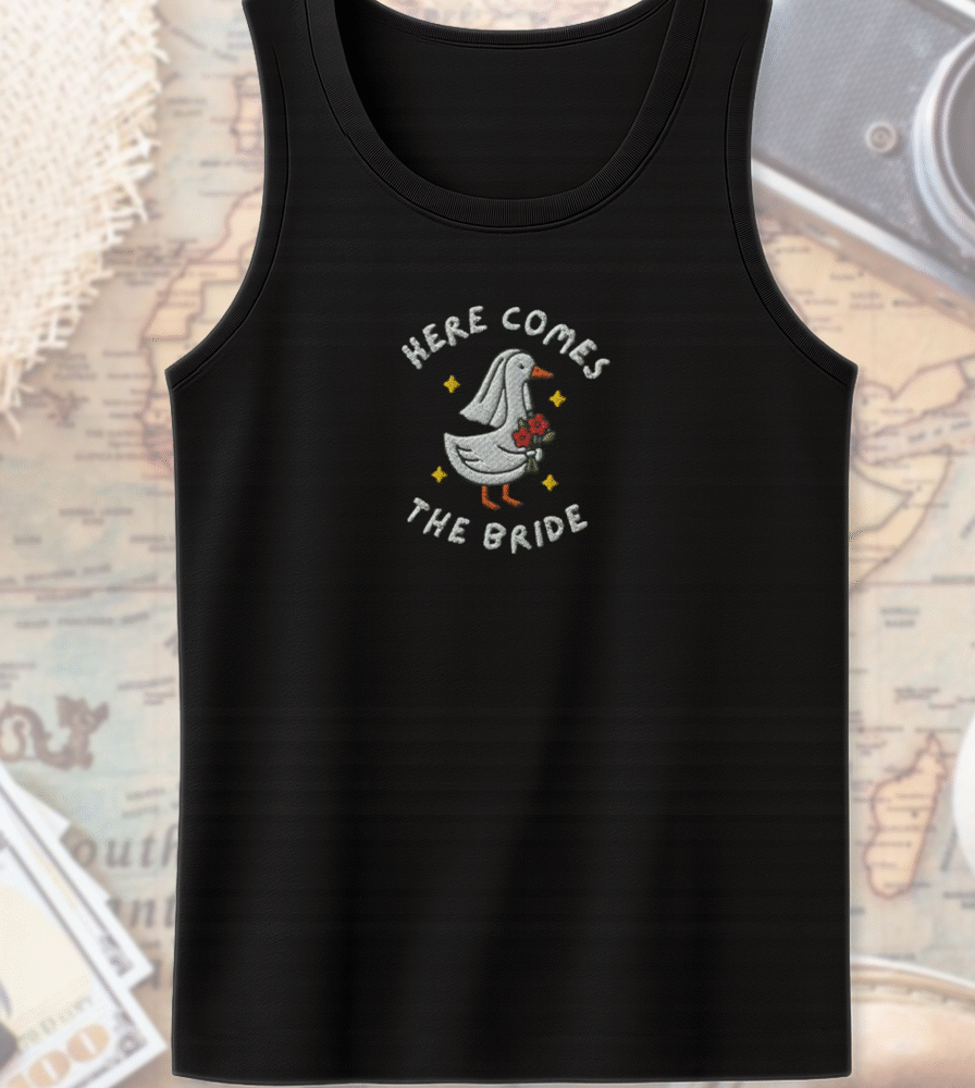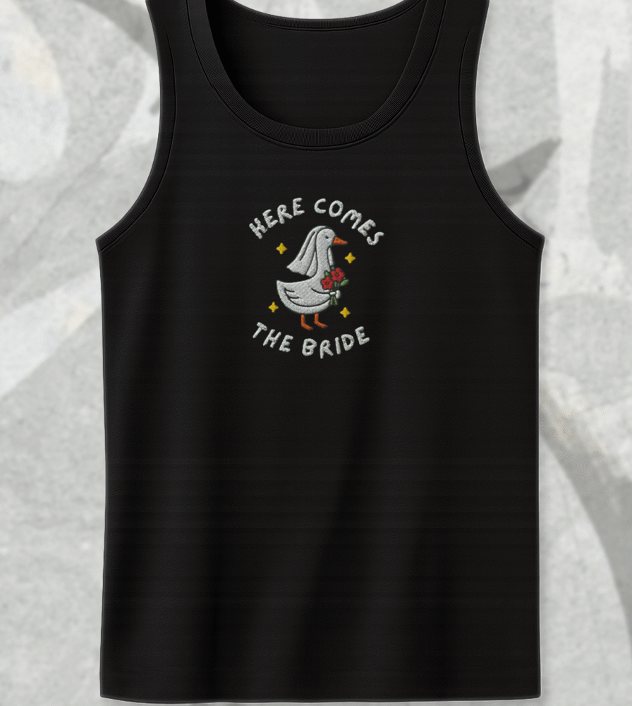 Featuring a dainty white goose in a veil and “Bride” script embroidered on the chest, this top is available in five flattering and comfy styles: classic tee, tank top, long sleeve, sweatshirt, and hoodie. Ideal for gifting or pairing with your bride tribe’s matching looks.