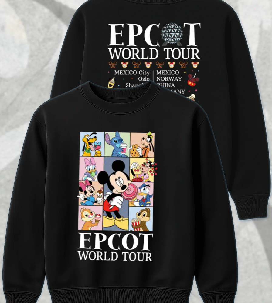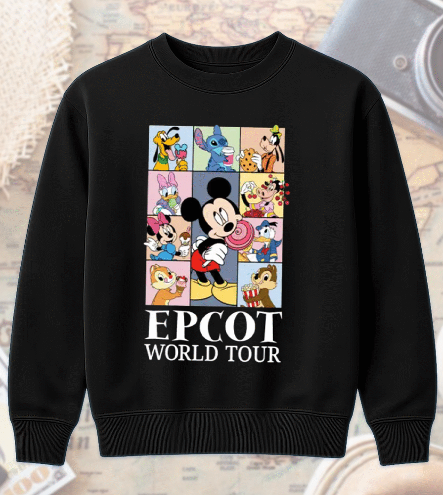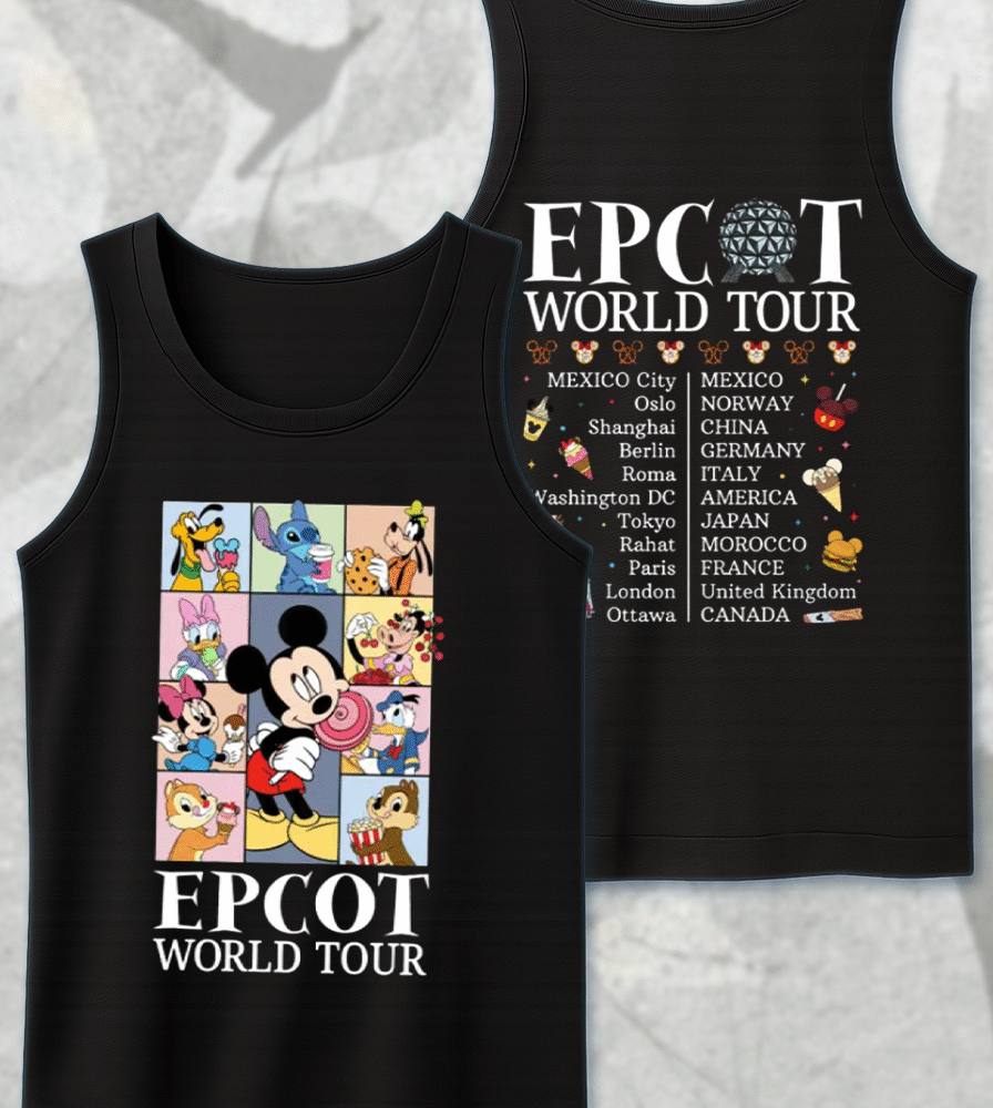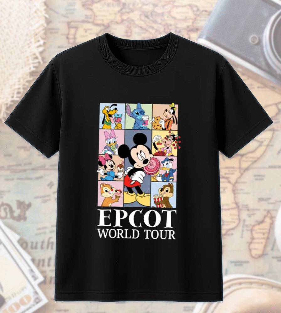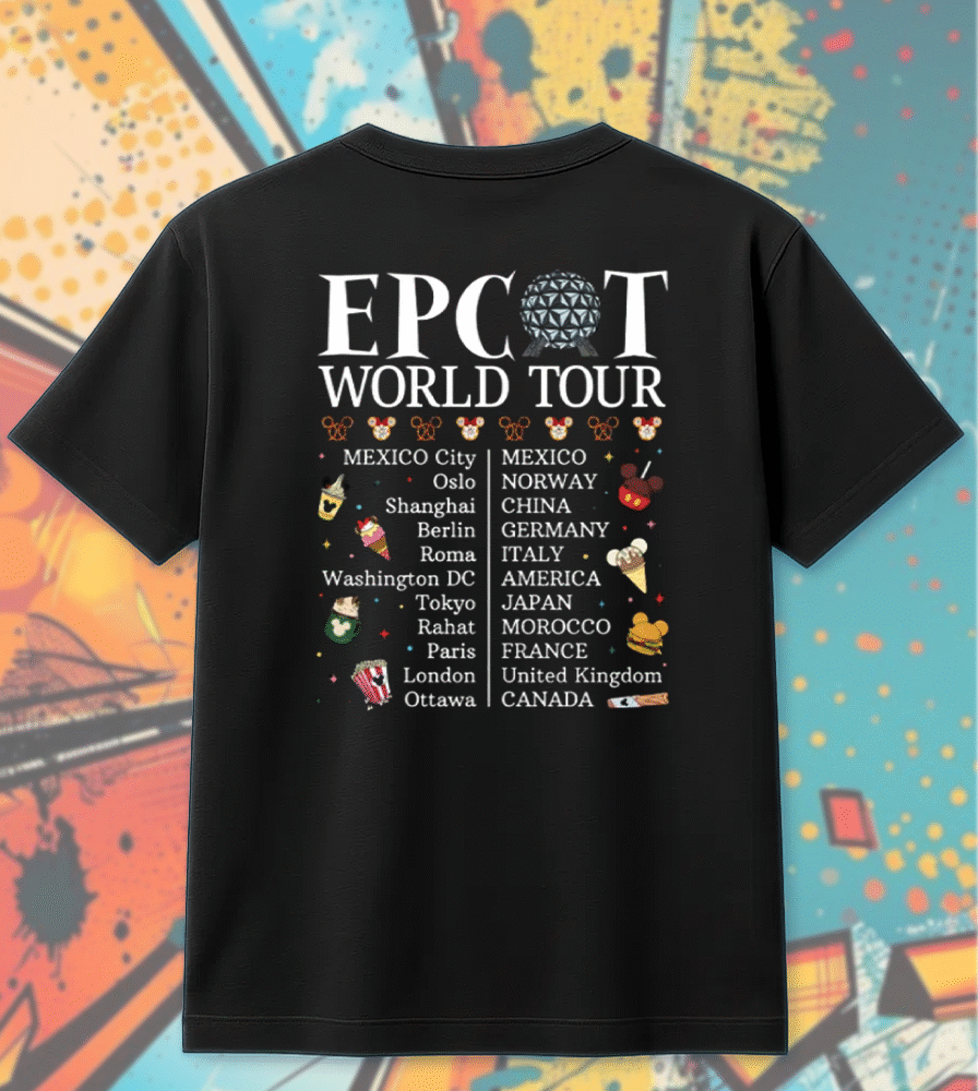Epcot is a world of creativity, culture, and fun. This collection honors that spirit with a Mickey and Friends design, featuring beloved Disney characters alongside the iconic landmarks of Epcot’s World Showcase. Whether you’re strolling through the parks or reliving your trip memories, this shirt is the ultimate Disney souvenir for fans of all ages.