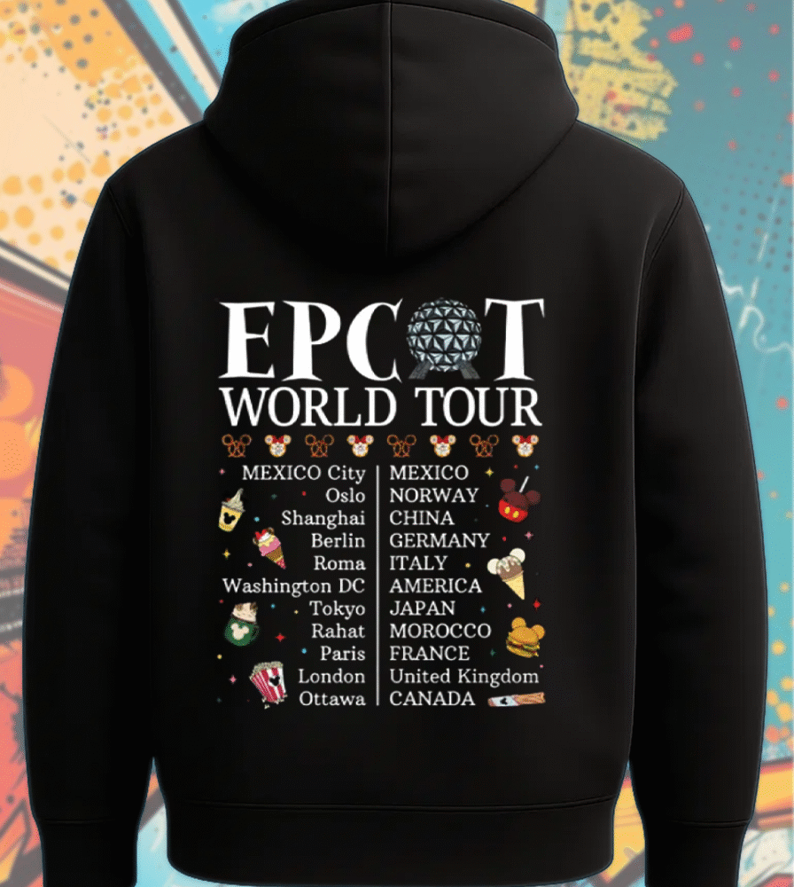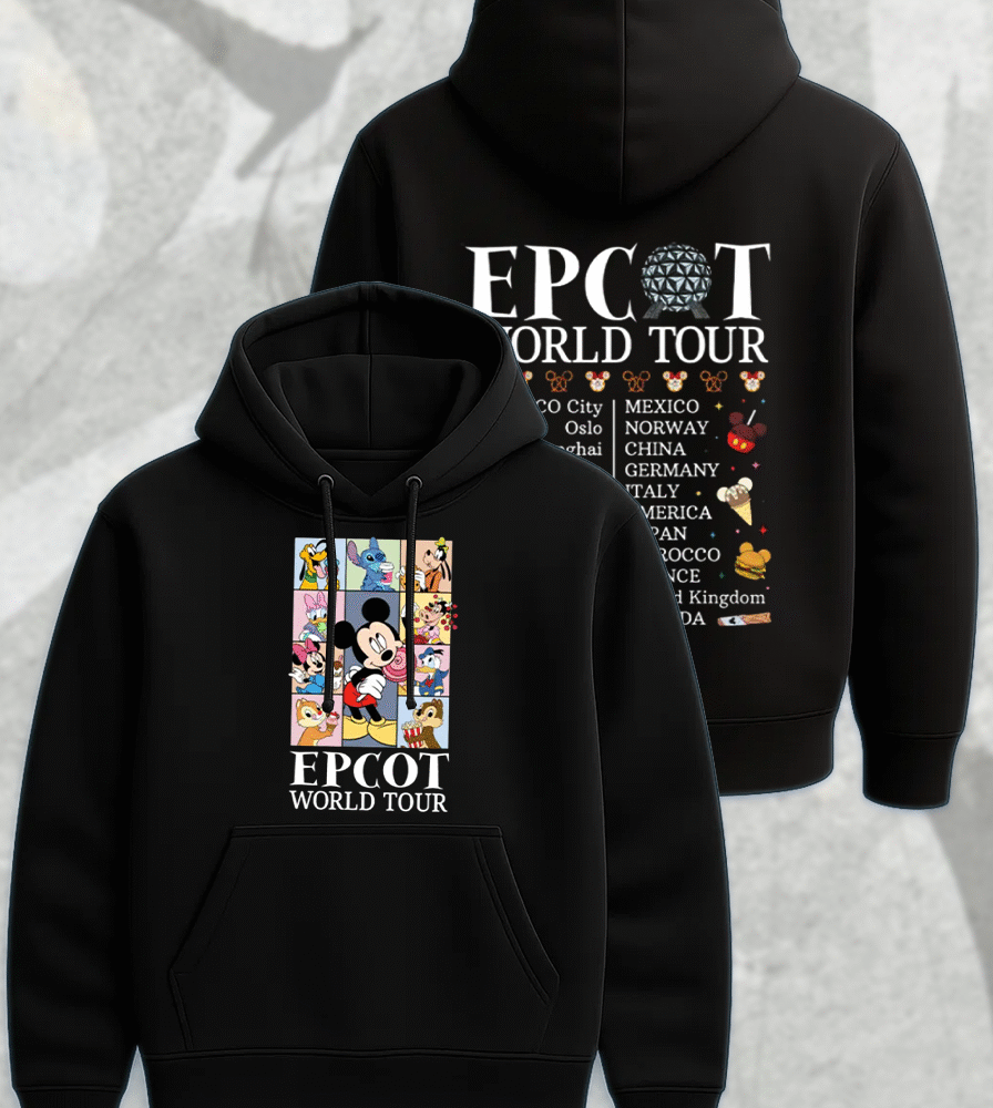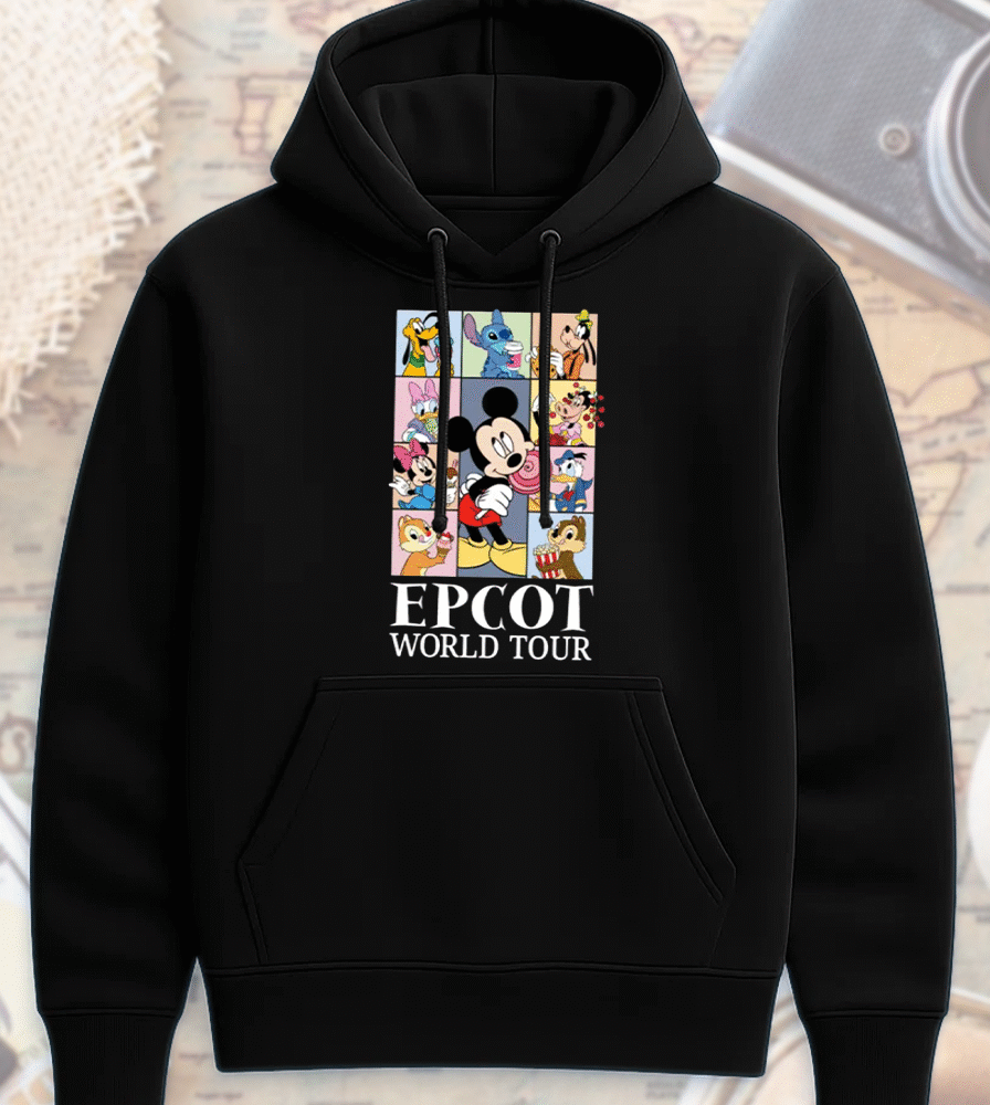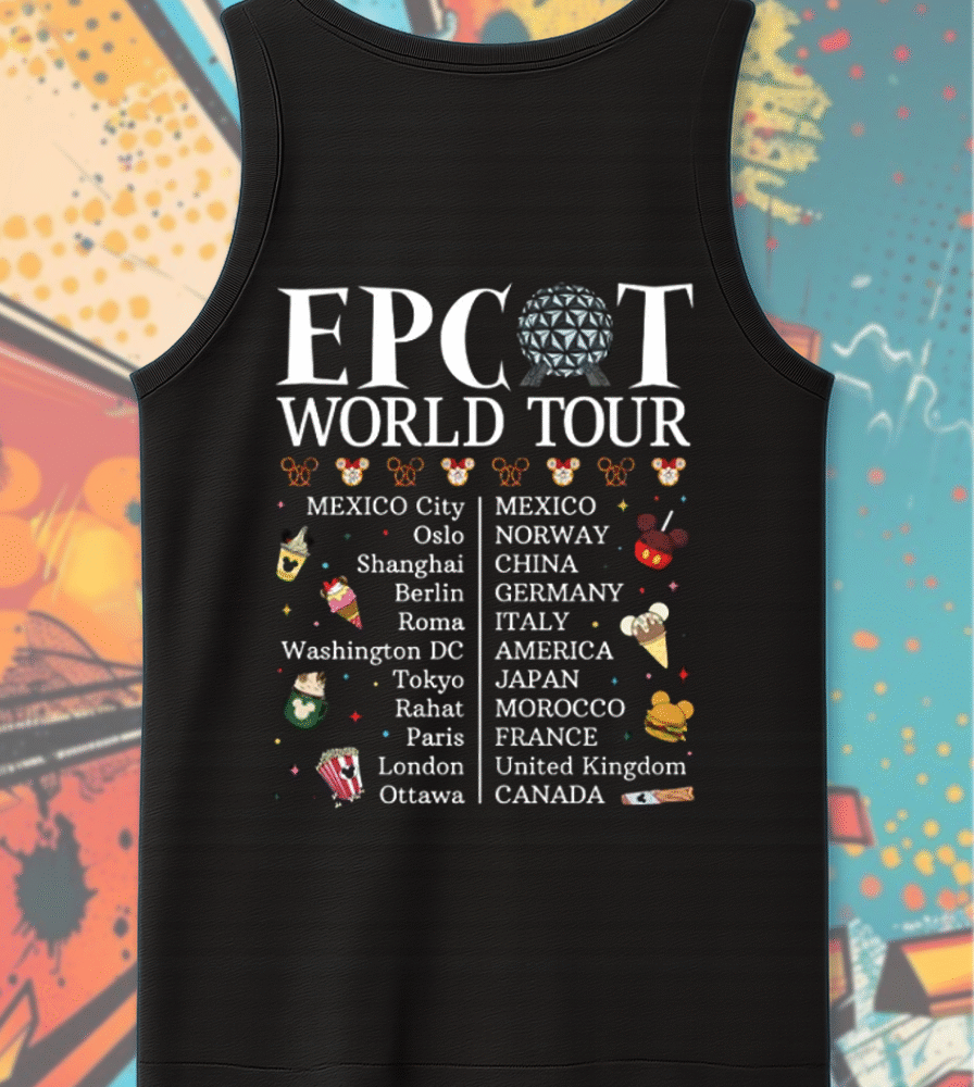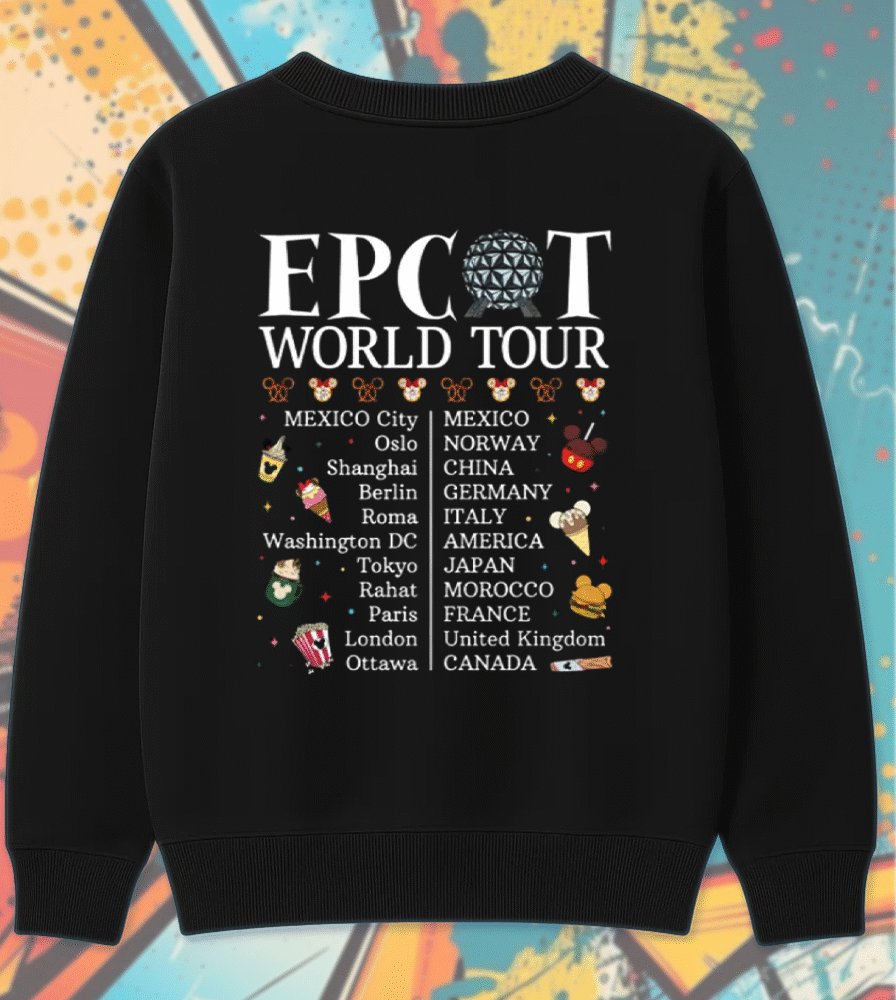Epcot is a world of creativity, culture, and fun. This collection honors that spirit with a Mickey and Friends design, featuring beloved Disney characters alongside the iconic landmarks of Epcot’s World Showcase. Whether you’re strolling through the parks or reliving your trip memories, this shirt is the ultimate Disney souvenir for fans of all ages.
