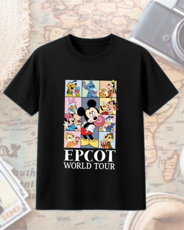 Epcot is a world of creativity, culture, and fun. This collection honors that spirit with a Mickey and Friends design, featuring beloved Disney characters alongside the iconic landmarks of Epcot’s World Showcase. Whether you’re strolling through the parks or reliving your trip memories, this shirt is the ultimate Disney souvenir for fans of all ages.