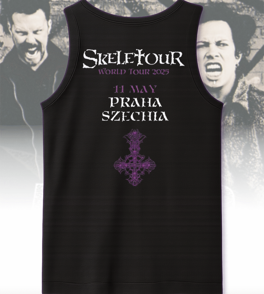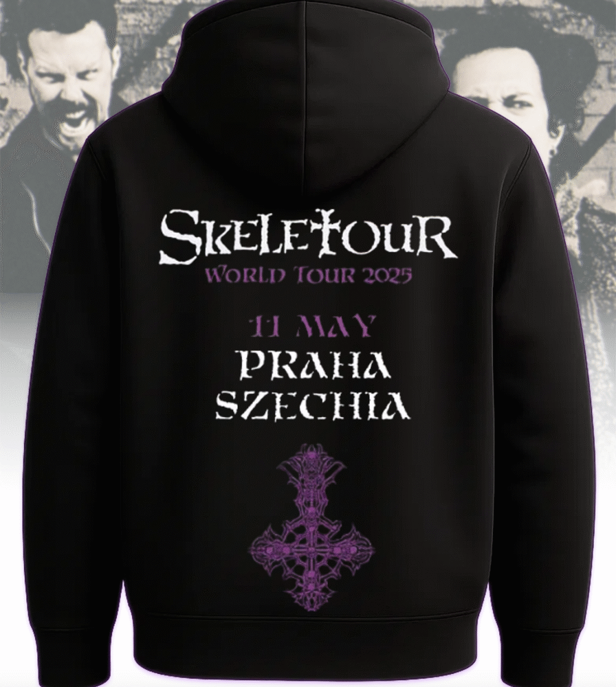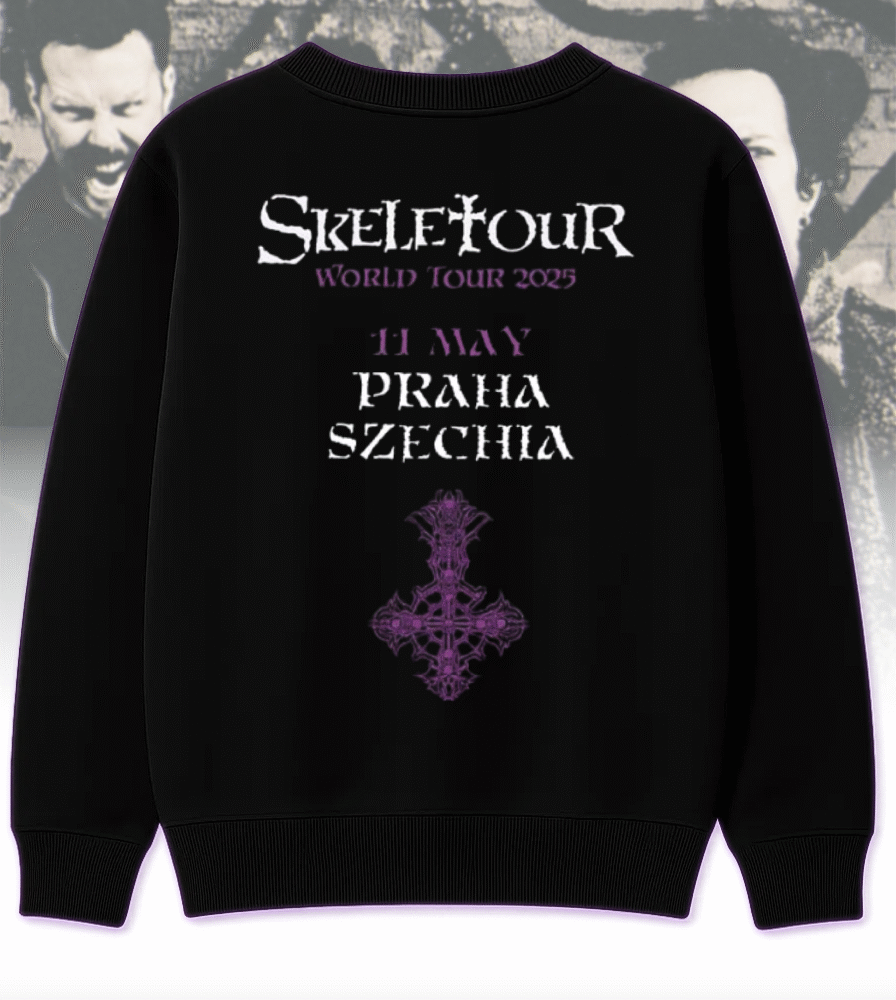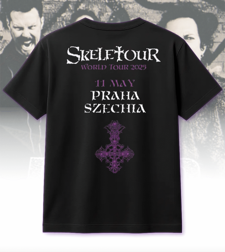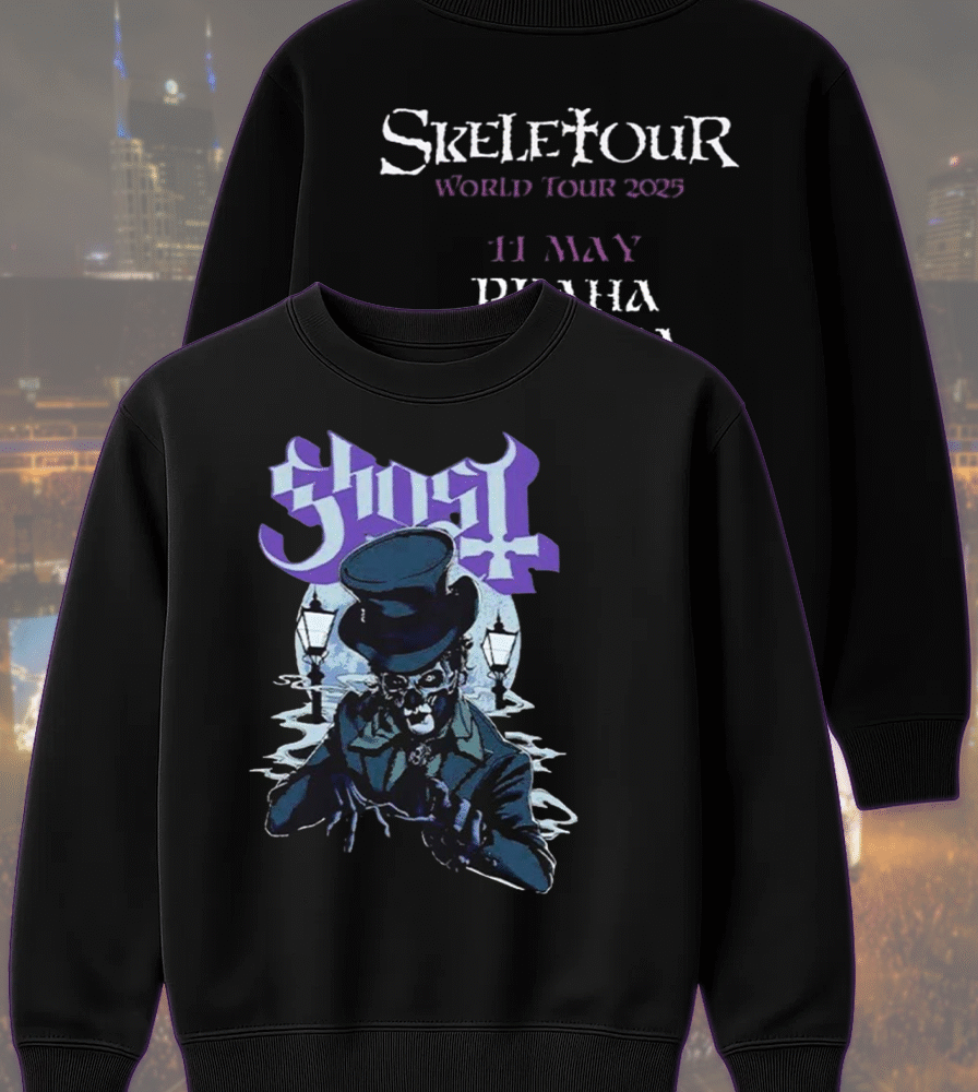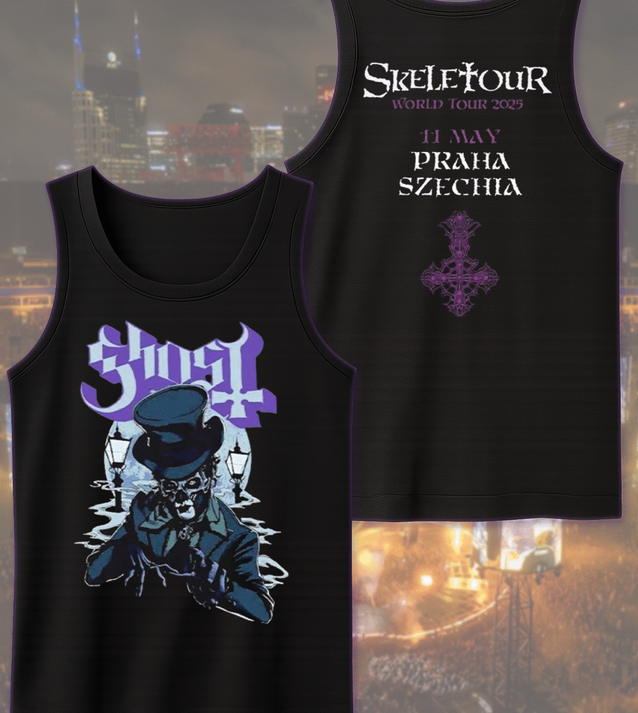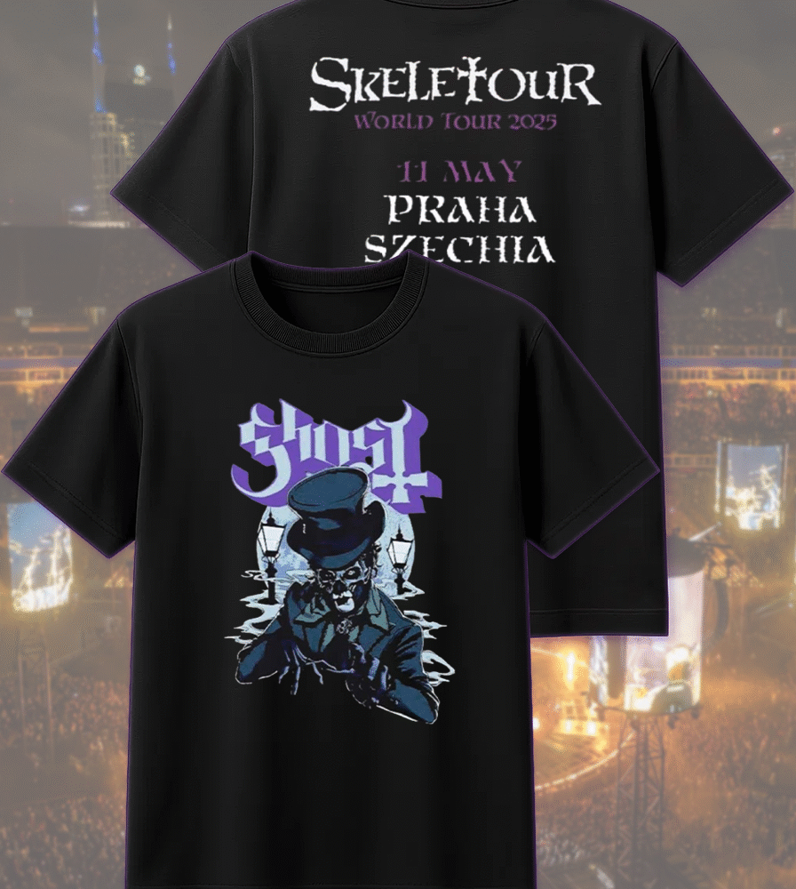Celebrate Ghost’s haunting presence in Praha, Czechia on May 11, 2025 with this exclusive two-sided apparel from their Skeletour World Tour pop-up shop. Whether you were front row at the concert or worship from afar, this design immortalizes the night the Ghouls took over Praha.