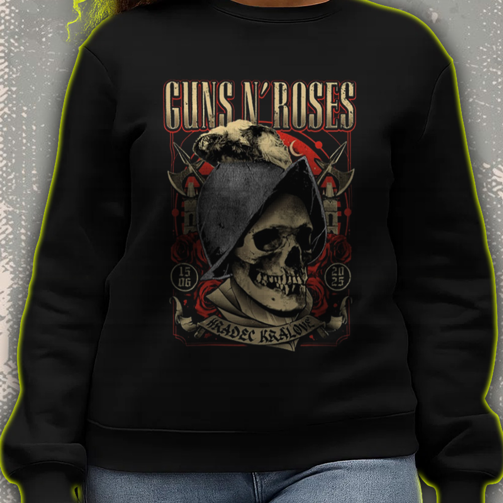 Relive the thunder of Guns N’ Roses live in Hradec Králové with this exclusive 2025 Tour Sweatshirt, designed for those who carry rock in their veins. Inspired by the epic June 15 performance, this bold collector’s piece features a striking skull-in-helmet graphic, wrapped in red roses and gritty gothic textures — the perfect fusion of danger and beauty.