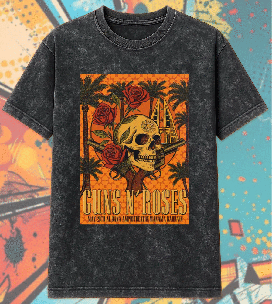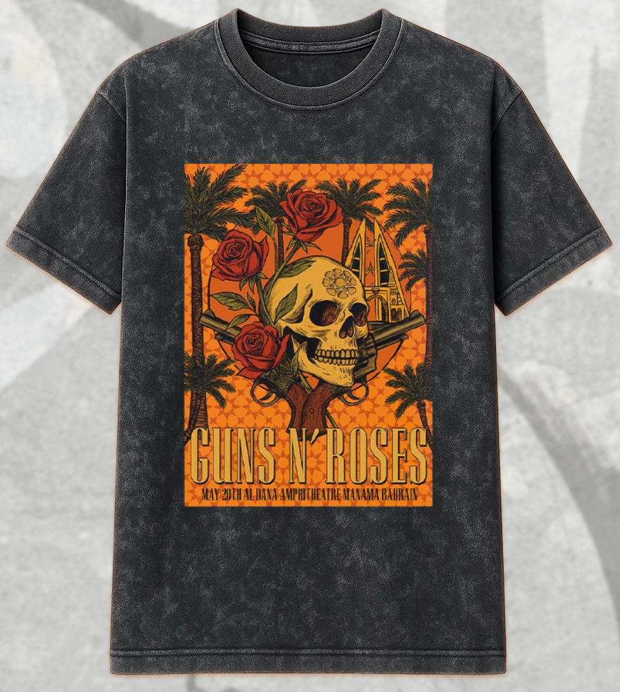 Celebrate Guns N’ Roses’ legendary live show at Al Dana Amphitheatre in Manama, Bahrain on May 20, 2025, with this exclusive acid wash tour apparel collection. Featuring bold poster artwork inspired by the official concert visuals, this design captures the raw, rebellious energy of GNR’s Middle East stop on their 2025 global tour.