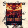 🌹 Designed with rich desert tones, the artwork features a skull entangled in blood-red roses and crossed pistols — set against palm trees and Middle Eastern architecture. It symbolizes the band’s gritty edge meeting a historic moment in rock history.