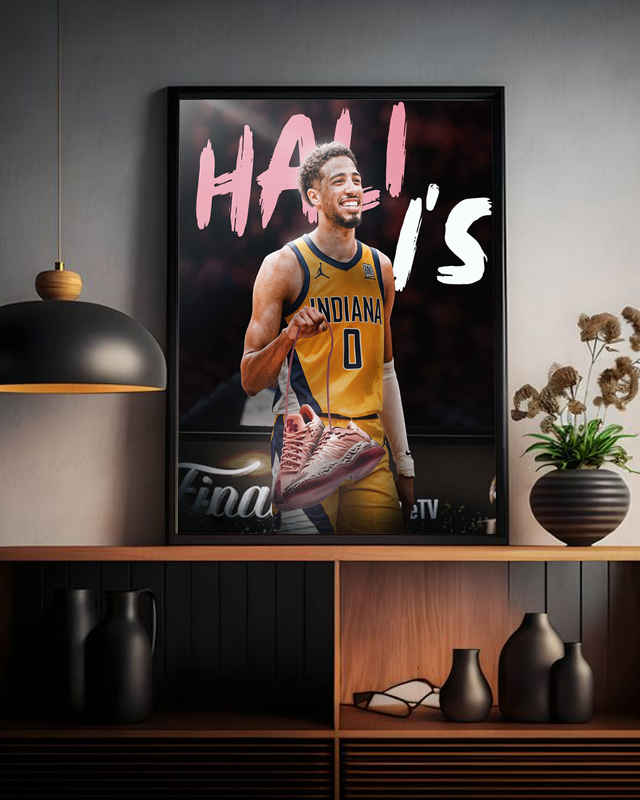 Celebrate a career-defining moment with this exclusive canvas poster featuring Tyrese Haliburton proudly unveiling his first signature sneaker — the PUMA Hali 1 — just ahead of Game 1 in the 2025 NBA Finals.