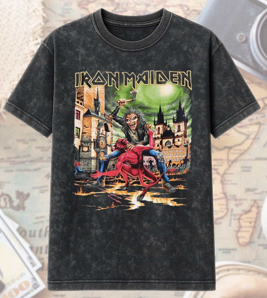 🎸 Iron Maiden Prague 2025 Acid Wash Shirt & Hoodie – Eddie vs Devil Two-Sided Tour Edition