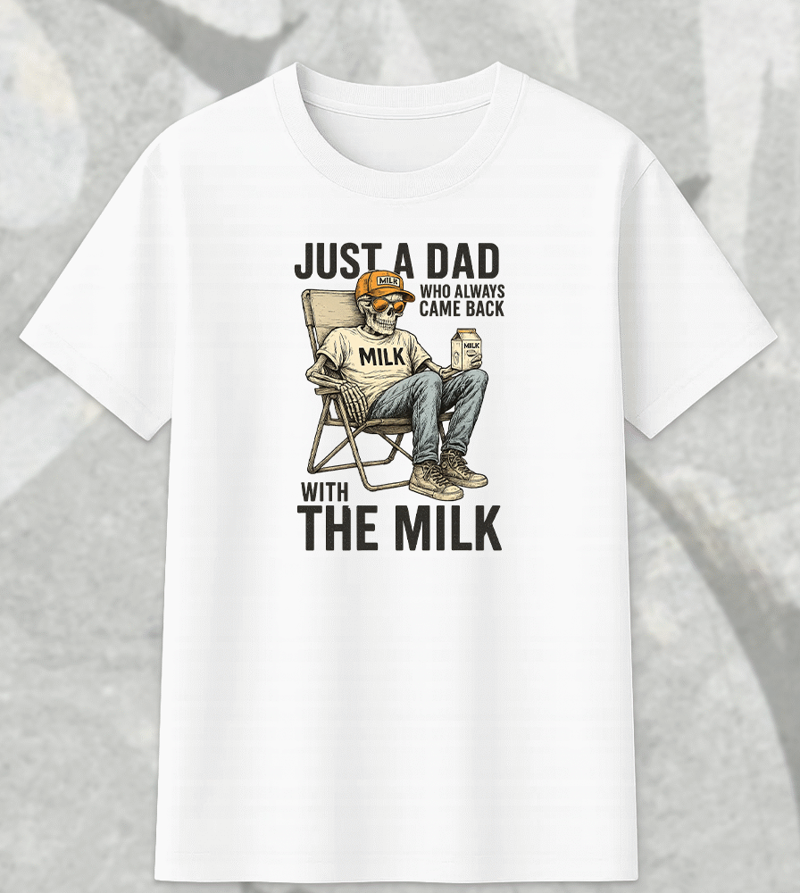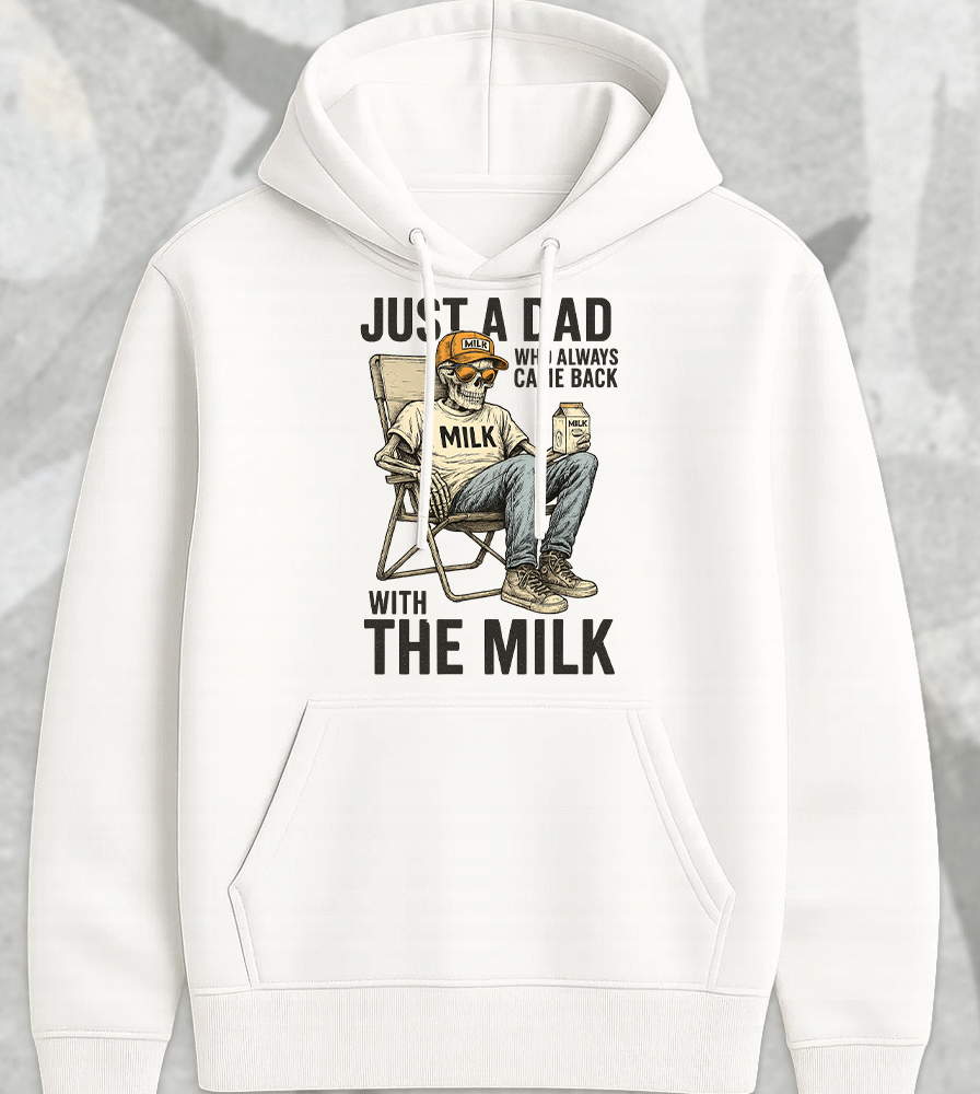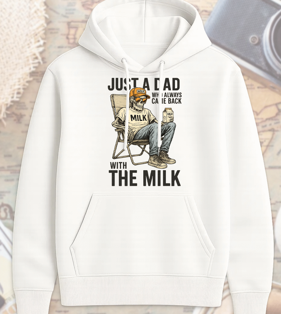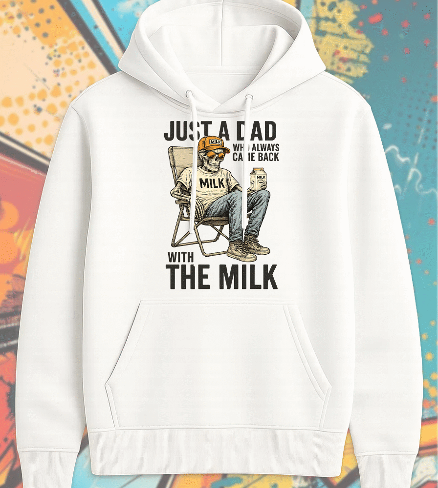 Show off your dad jokes and sense of humor with this hilarious “Just A Dad Who Always Came Back With The Milk” T-shirt and hoodie collection, featuring a retro skeleton design. Perfect for Father’s Day or any day you want to remind everyone that dad jokes are eternal. This funny design is a must-have for fathers who know how to laugh and make everyone else laugh too.