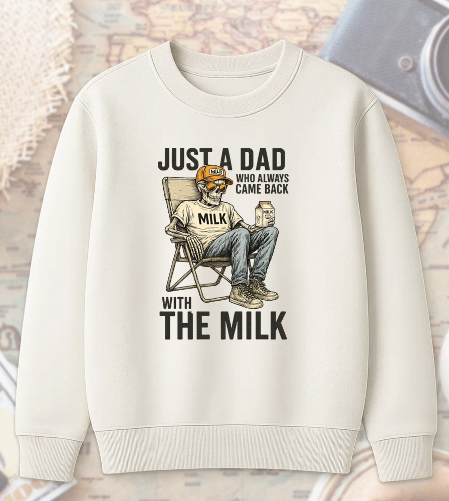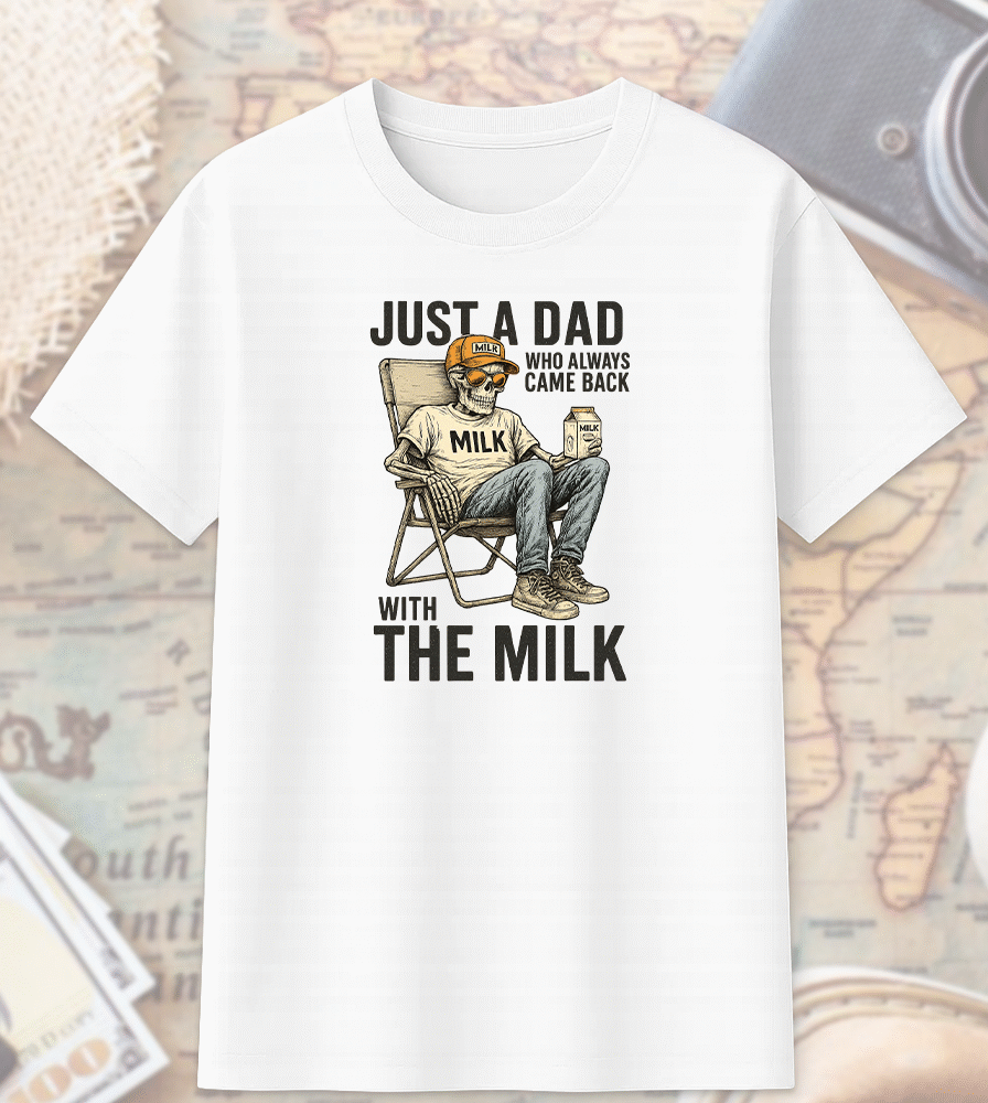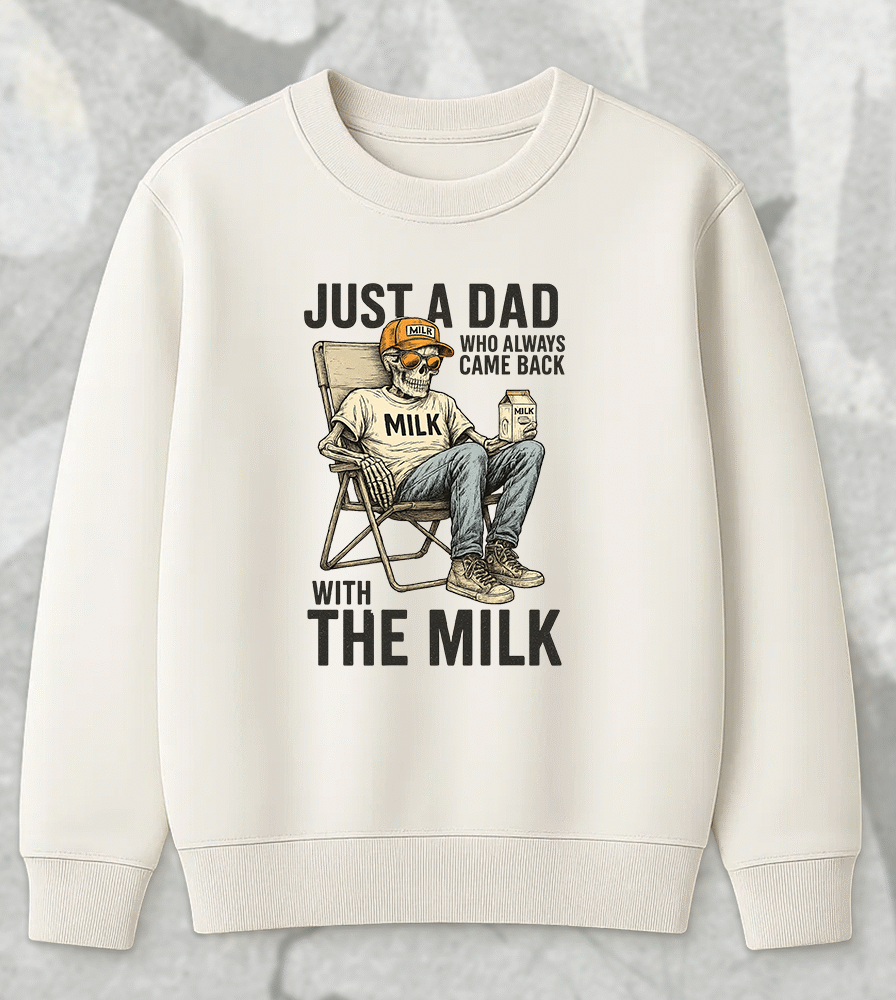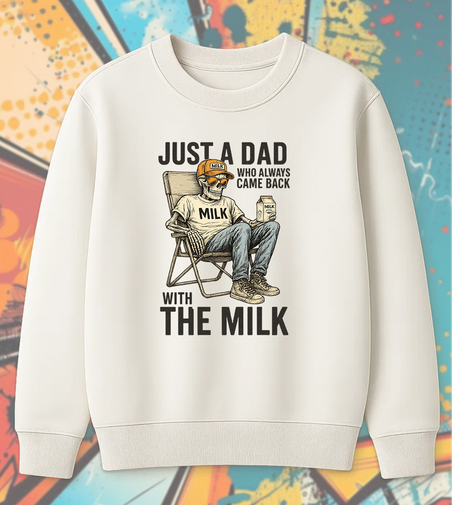 Show off your dad jokes and sense of humor with this hilarious “Just A Dad Who Always Came Back With The Milk” T-shirt and hoodie collection, featuring a retro skeleton design. Perfect for Father’s Day or any day you want to remind everyone that dad jokes are eternal. This funny design is a must-have for fathers who know how to laugh and make everyone else laugh too.