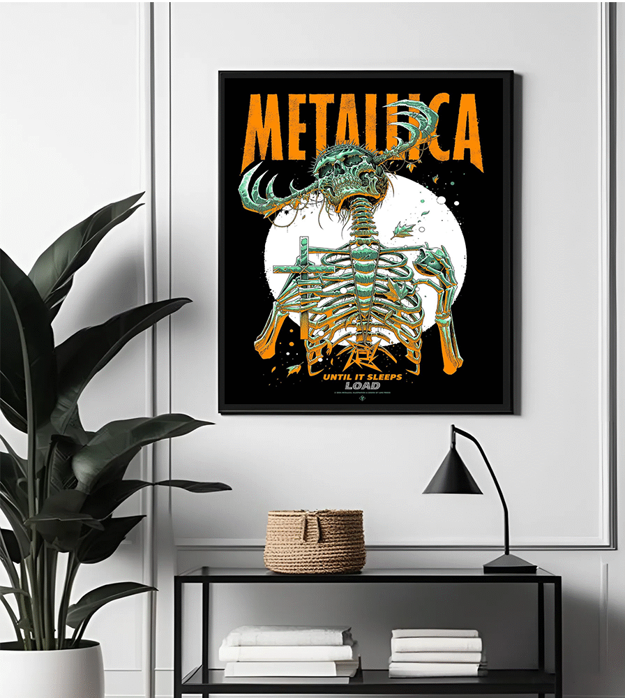 The skeletal figure — pierced, crowned, and tangled in crucifixion — evokes the vulnerability and fury found in Metallica’s 1996 hit “Until It Sleeps.” This museum-quality print is perfect for collectors of rare Metallica artwork and fans of the introspective, experimental Load era. Whether framed in your music studio, hallway, or vinyl room — it demands attention.
