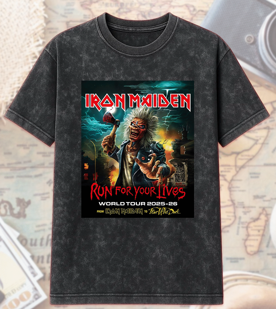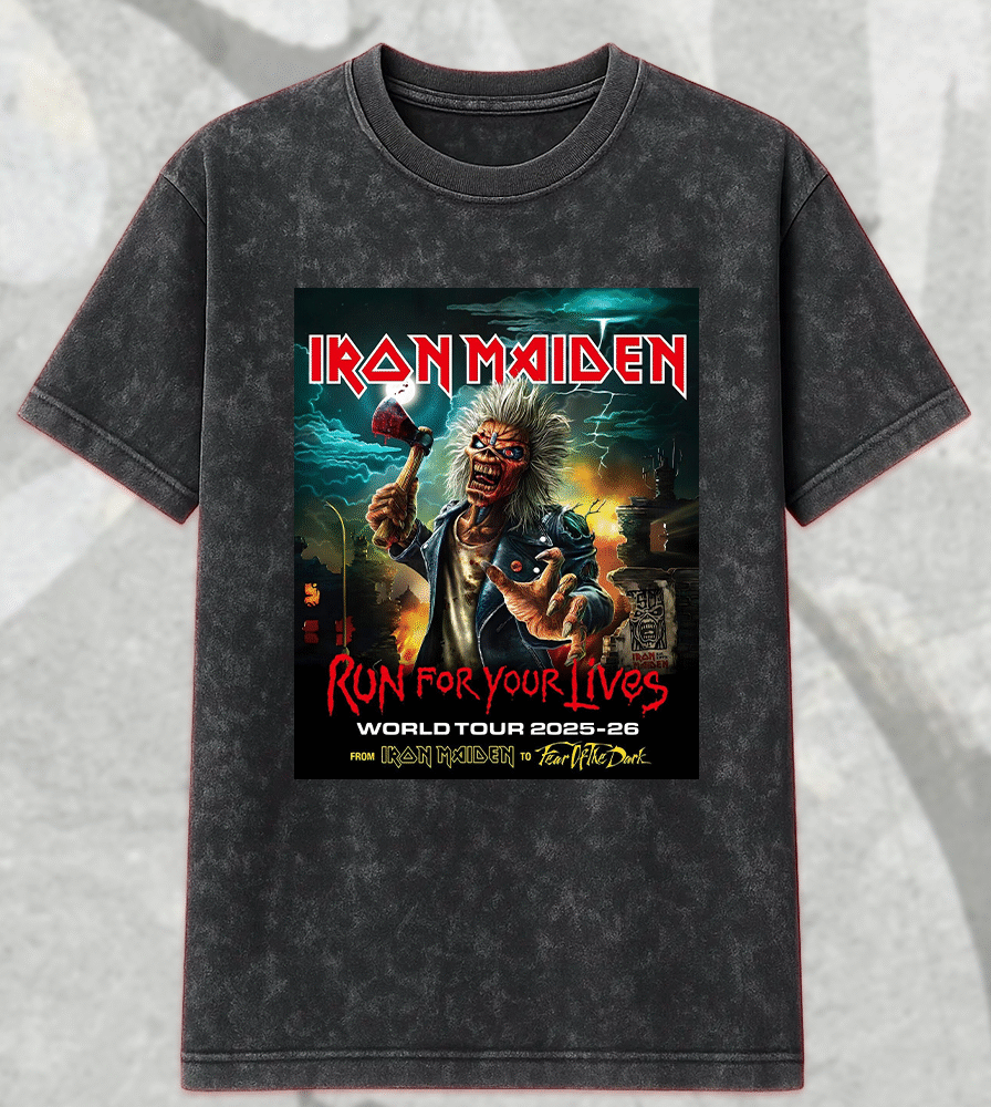 Celebrate the Iron Maiden Tour 2025-26 with this exclusive Run for Your Lives Tour collection, featuring acid wash T-shirt and hoodie styles. The shirt showcases bold tour dates alongside the iconic design, bringing the power of Iron Maiden’s Run for Your Lives tour straight to your wardrobe. This vintage acid wash edition gives you that worn-in feel while showing off your undying love for metal!