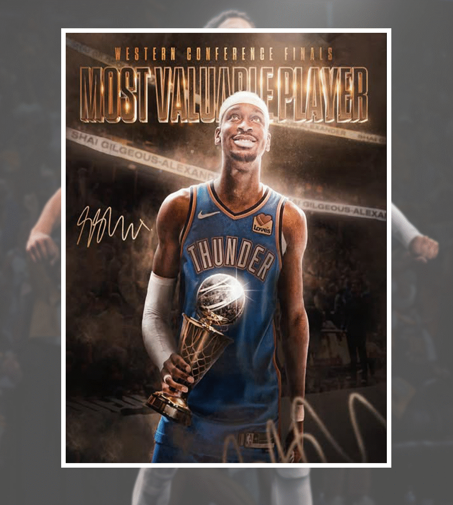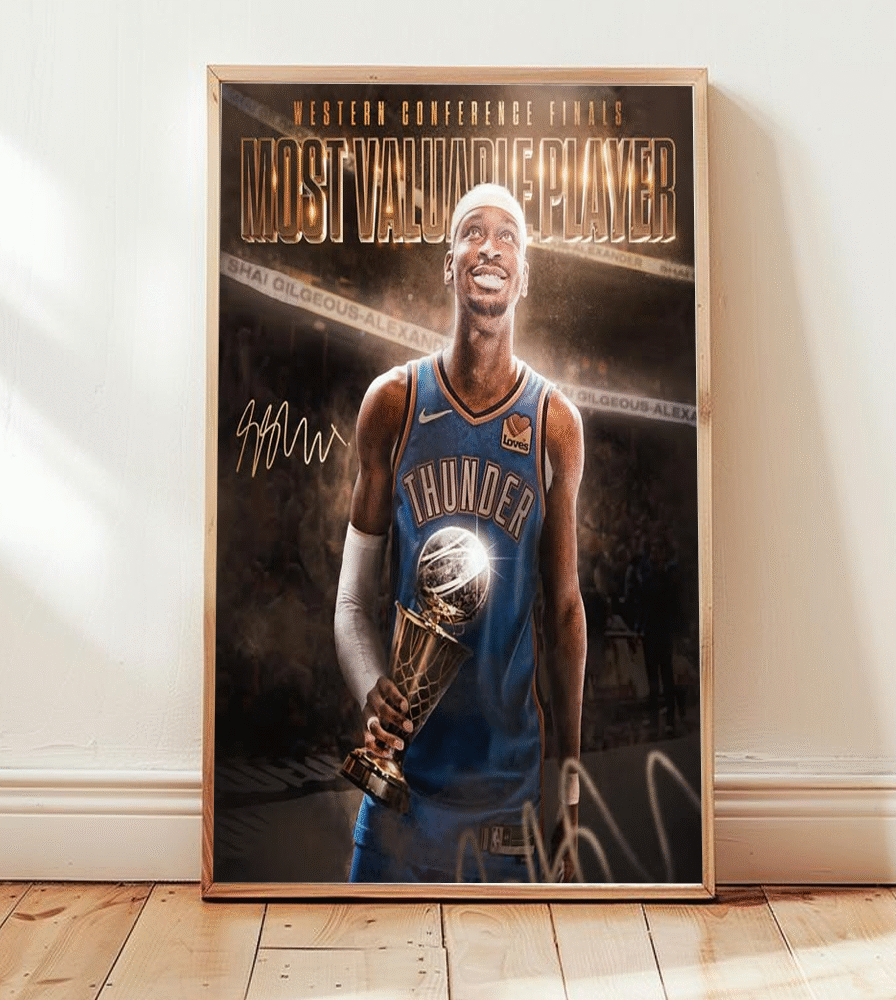 Honor Shai Gilgeous-Alexander’s MVP performance in the 2025 Western Conference Finals with this stunning canvas poster — a must-have for Oklahoma City Thunder fans and basketball collectors. Featuring a high-quality action shot of Gilgeous-Alexander during his standout performances, this wall art piece perfectly captures the intensity and spirit of his incredible postseason run.