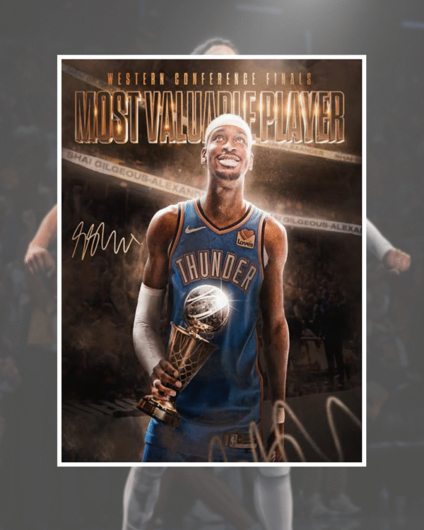 Honor Shai Gilgeous-Alexander’s MVP performance in the 2025 Western Conference Finals with this stunning canvas poster — a must-have for Oklahoma City Thunder fans and basketball collectors. Featuring a high-quality action shot of Gilgeous-Alexander during his standout performances, this wall art piece perfectly captures the intensity and spirit of his incredible postseason run.