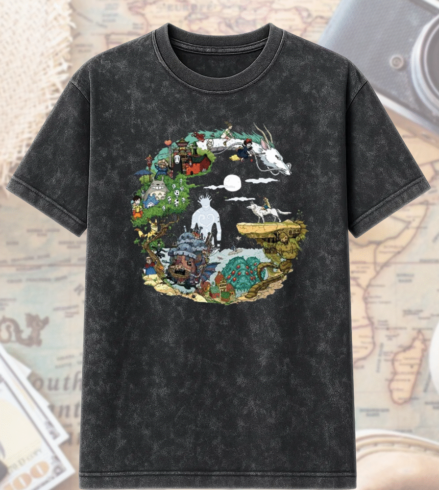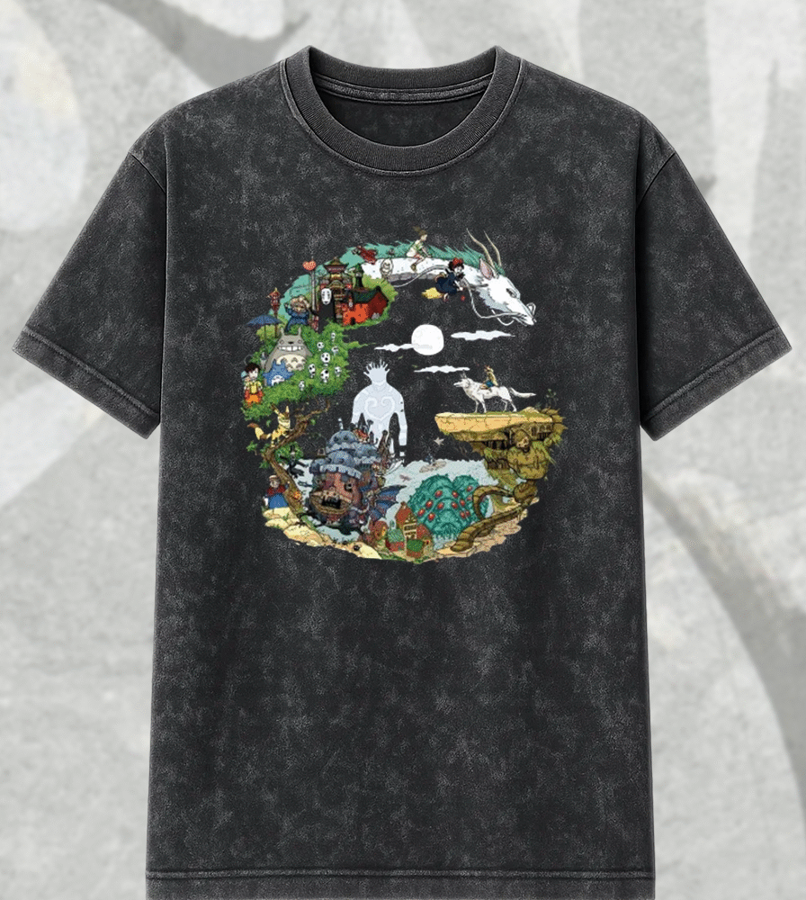Dive into the beloved worlds of Studio Ghibli with this Acid Wash T-Shirt and Hoodie Collection, featuring iconic designs from Spirited Away, My Neighbor Totoro, and Howl’s Moving Castle. Whether you’re a die-hard Hayao Miyazaki fan or a newcomer to his magical films, these acid-washed pieces bring the beauty of Ghibli’s animation to life, with a vintage, distressed finish that celebrates the artistry of these timeless classics.