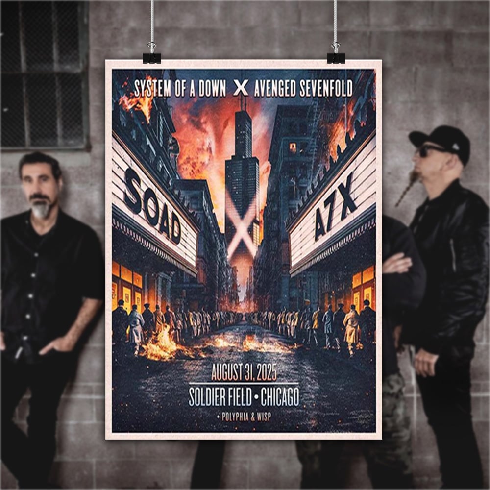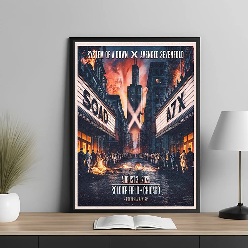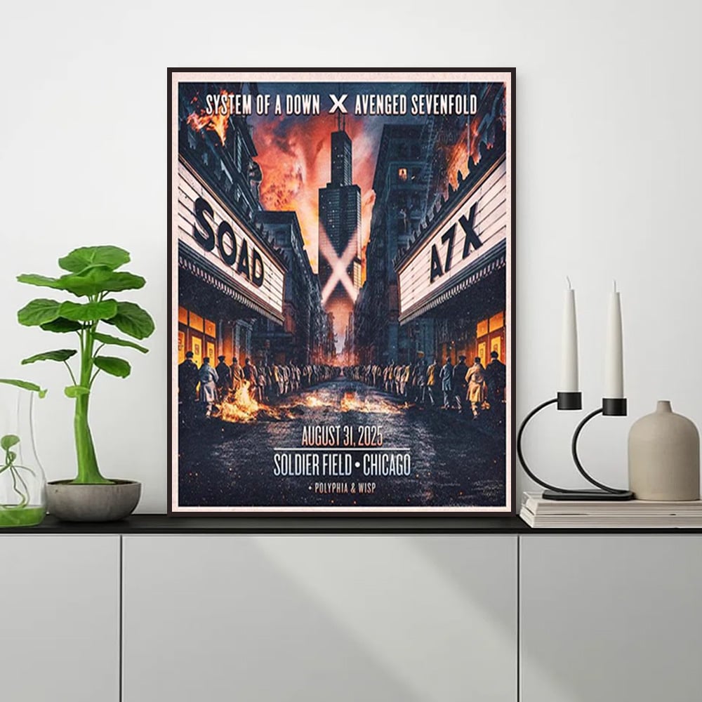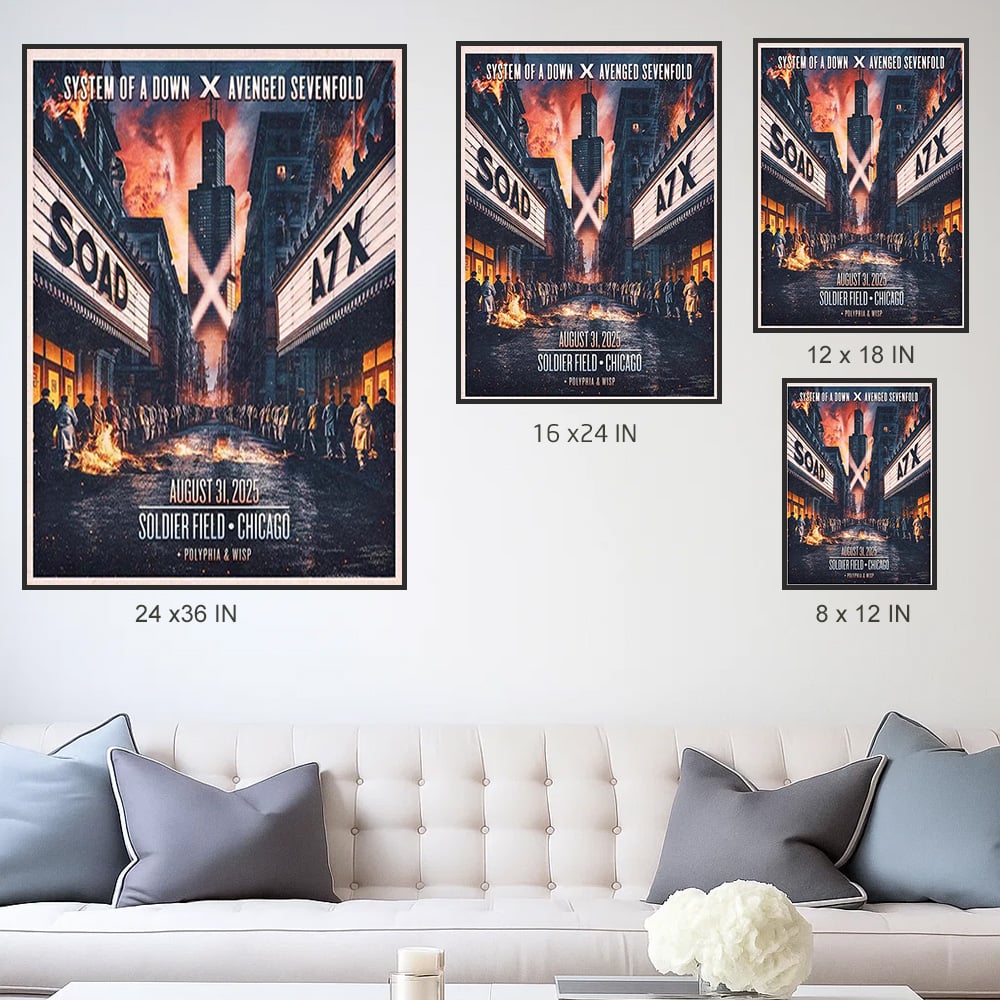 On August 31 & September 1, 2025, two heavyweights of rock and metal—System Of A Down and Avenged Sevenfold—will share the stage at Soldier Field in Chicago, Illinois. This Poster Canvas immortalizes those legendary nights with exclusive tour artwork.