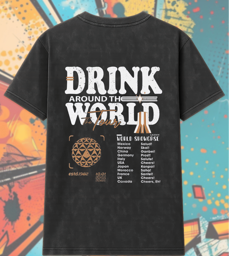 Epcot’s Drink Around the World challenge is a rite of passage for every Disney fan, and this design captures the fun and excitement of exploring international pavilions. With its faded, retro aesthetic, the acid-wash finish on the T-shirt and hoodie makes it feel like a true piece of vintage Disney memorabilia. Whether you’re traveling through the parks or just want a comfy, stylish reminder of your favorite adventures, this drop is the perfect tribute.